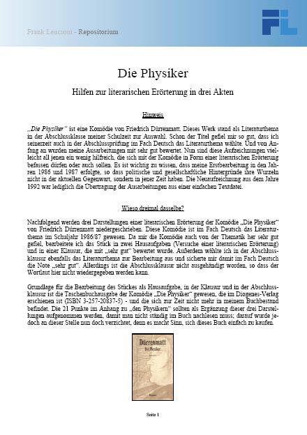 Hierbei handelt es sich um drei literarische Interpretationen zur Komödie Die Physiker von Friedrich Dürrenmatt. Die Interpretationsansätze und auch die alten Betrachtungsweisen sind sogar heute noch hochaktuell, obgleich seit jener Ausarbeitungen schon knapp 30 Jahre vergangen sind.