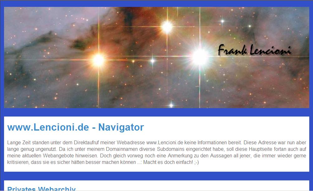 Die hier mit einem Screenshot vorgestellten Webseiten waren und sind technisch sehr anspruchsvoll und basieren auf Framework-Technologien. Allerdings bin ich bis heute nicht dazu gekommen, diese Systeme weiterzuentwickeln oder sie gar mit Inhalten zu bestücken. Das ist nun auch der Grund dafür, dass ich diese Seiten nicht mehr in vollem Funktionsumfang anbieten werde - vielleicht gerade noch einmal zum Drüberklicken oder Testen: