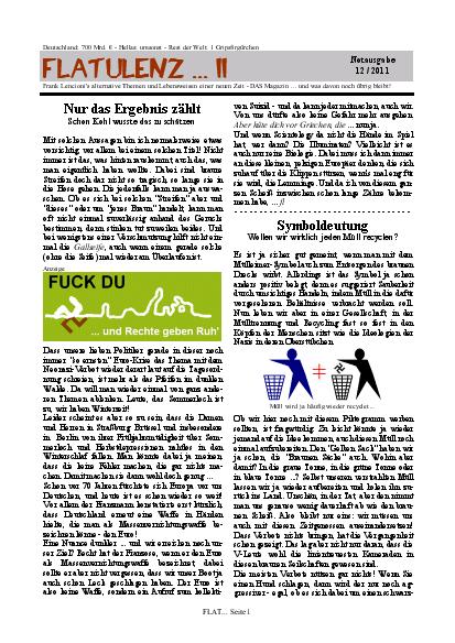 Was Flatulenzen sind, wissen Sie sicher. Doch hier handelt es sich um ein Wort, das seine Bedeutung aus den Anfangsbuchstaben der Wörter des Titels Frank Lencionis alternative Themen und Lebenweisen einer neuen Zeit erhalten hat. Auch wenn ich hier neue Themen aufgegriffen habe, werden Sie feststellen, dass sich in den letzten 30 Jahren nicht wirklich viel verändert hat ...